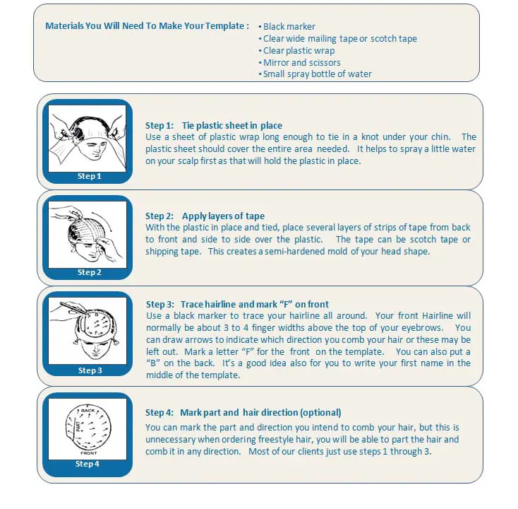 For Custom Hair System orders, it is best to send in a template (or a hair system we can duplicate) to ensure your hairline, size and color, density, etc. Then, fill out our on-line order for your Custom Hair System, and that’s all there is to it! Send the template to our Address on our Contact Us Page. Please send the template in an envelope, not a box.