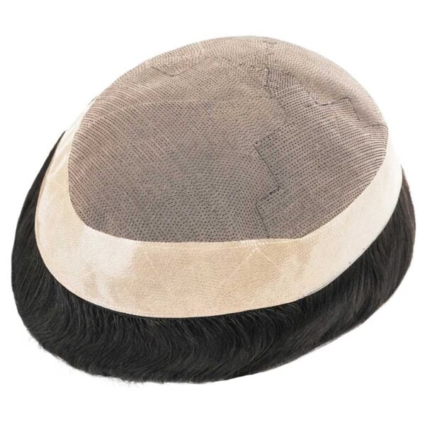 This is one of the most durable base designs. The base is a strong fine mono in the middle with a durable PU coating perimeter. The front is 1/8” folded mono lace. This fine mono hairpiece can last for a very long time.