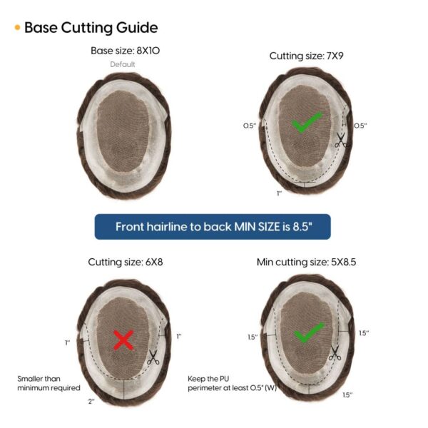 Small: 5" x 7" to 6" x 8" – Suitable for minor thinning or small bald spots, often on the crown. Medium: 7" x 9" to 8" x 10" – Covers moderate hair loss, commonly used for receding hairlines or larger crown areas. Large: 9" x 11" to 10" x 12" – Designed for extensive hair loss, covering most of the top and front of the scalp.